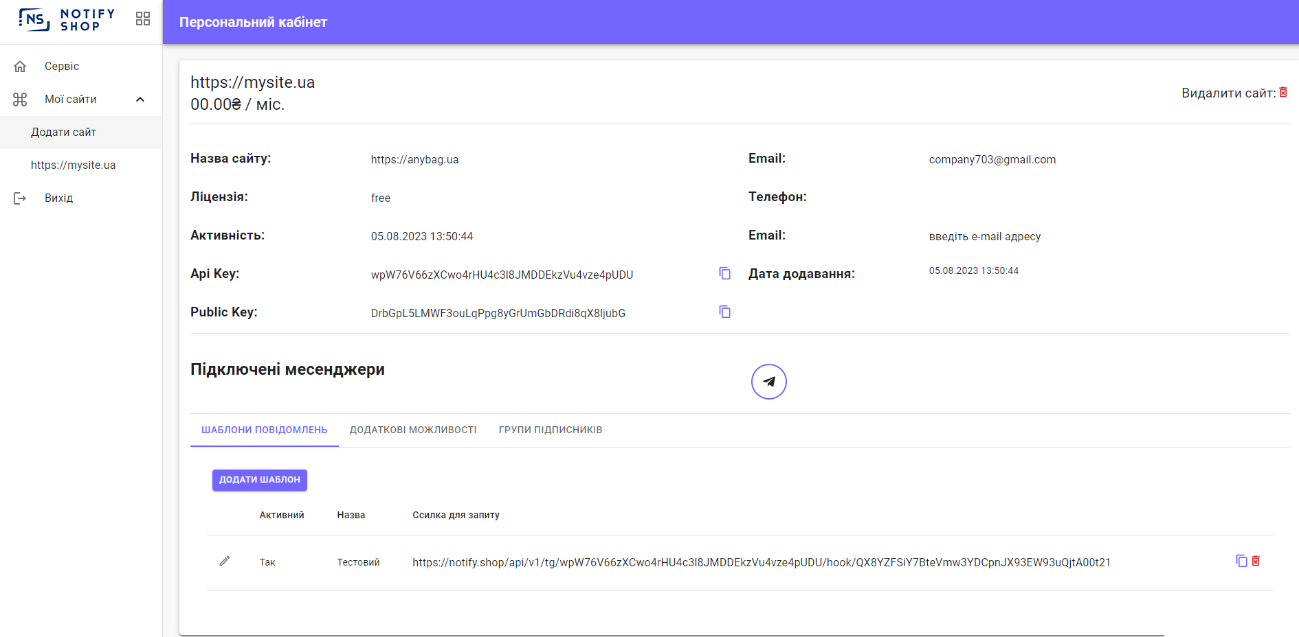 В персональному кабінеті ціла система управління сайтом, шаблонами, месенджерами, каналами та багато іншого